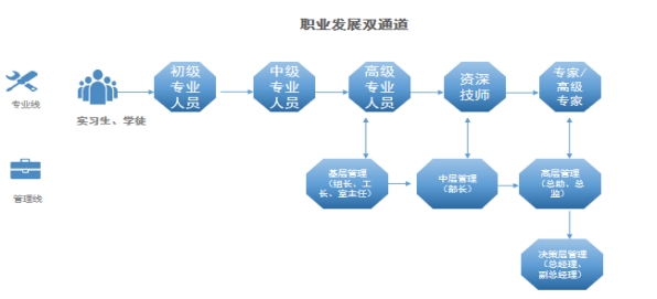 公司提供完善的晋升通道。专业线、管理线,双通道职业发展。支持跨业务、跨线条切换发展。