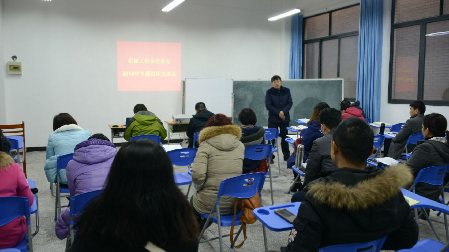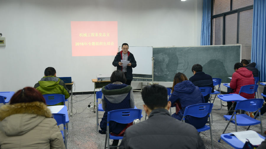1月11日下午,机械工程系党总支在5217教室召开2016年专题组织生活会,会议由机械工程系党总支代理副书记陈小怡同志主持,联系院领导贺元成及全体党员教师参会。