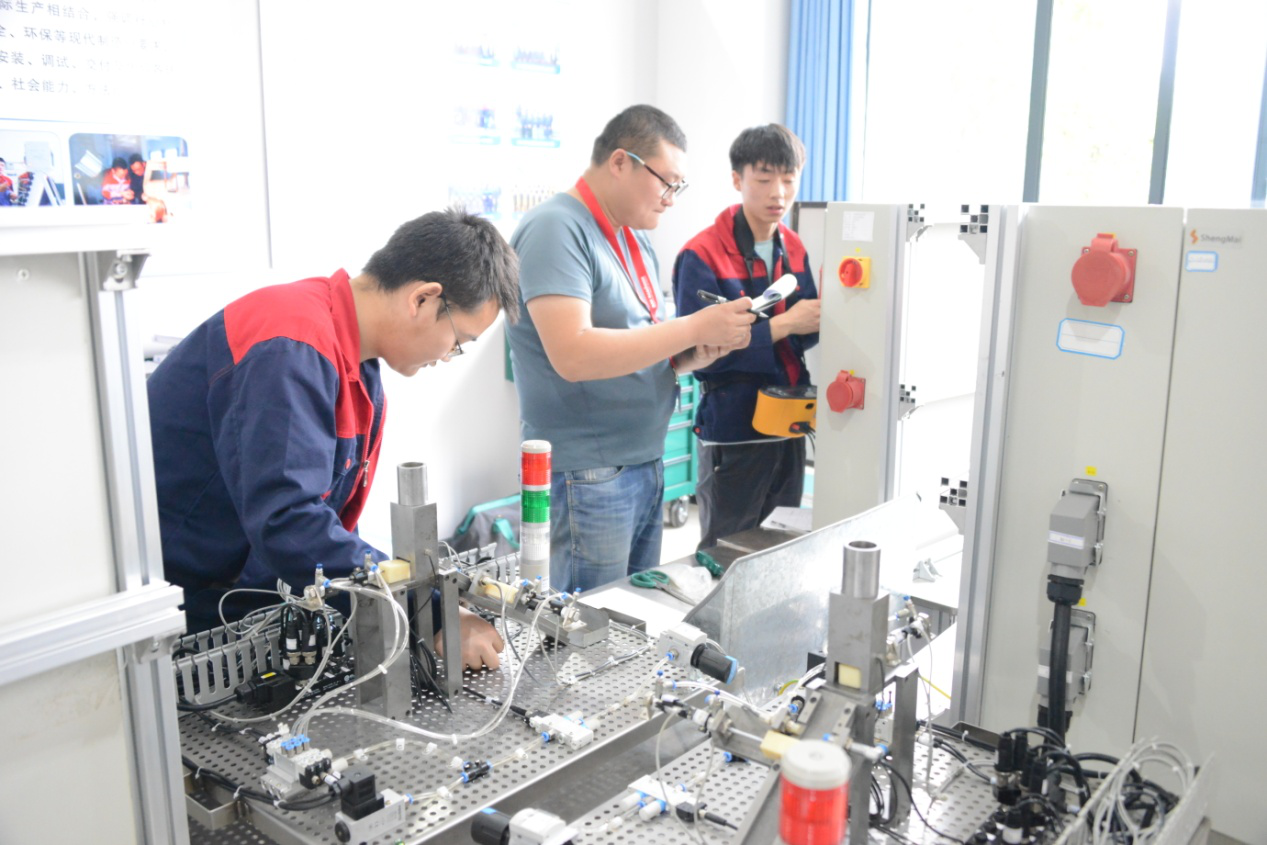 2016级机电一体化师实操考试时长6.5小时,分3组进行,主要考核考生手动机械加工、气动控制、电气控制等方面的操作能力,并在项目完成后进行现场的解说,考核考生对项目的理解和语言表达能力。