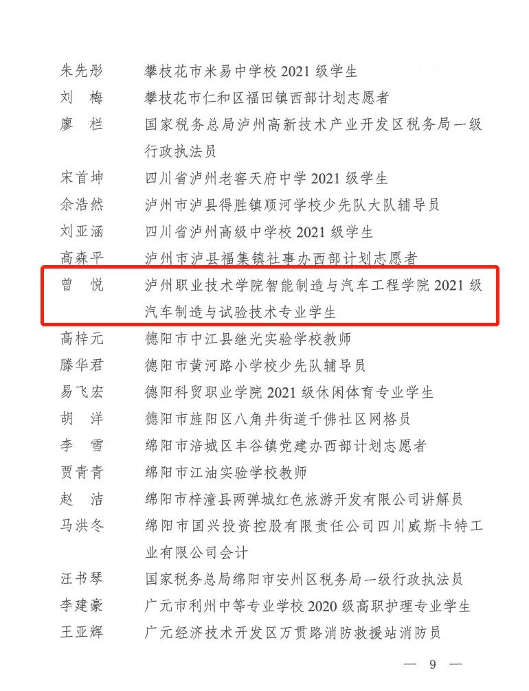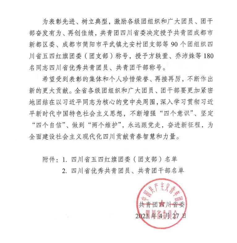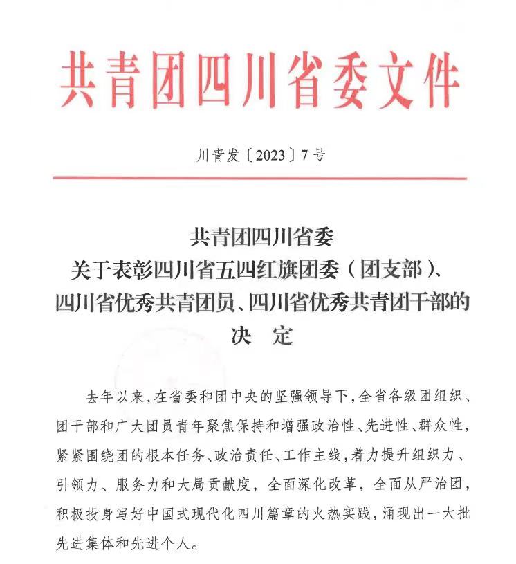 近日,共青团四川省委颁发川青发[2023]7号文件,威廉希尔体育2021级汽车制造与试验技术专业员工曾悦经审核、公示无异议,被团省委评为“四川省优秀共青团员”。