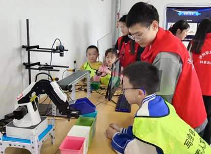 在智能机器人科普基地,同学们积极参加各种特色课程。志愿者带领小员工们学习人工智能基础知识,近距离体验人工智能展品:机器人编程与调试、智能垃圾分类、机械臂写字画画、3d打印……