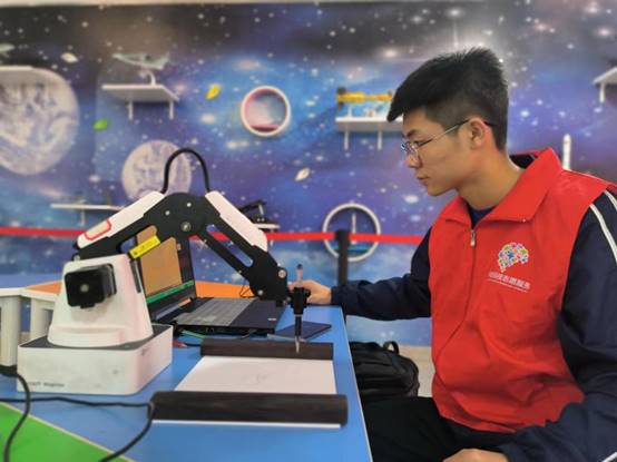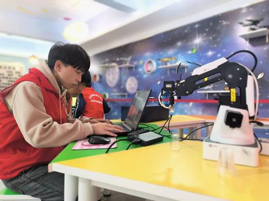 志愿者游冰给同学们上了一节智能机器人科普课。通俗易懂地跟同学讲解什么是机器人?机器人能做什么?机器人这个词汇是谁首先提出来的?未来的机器人会是怎样的?游冰给大家讲解了科普现场的机器人,同学们也动起来,体验机器人一把的操作。